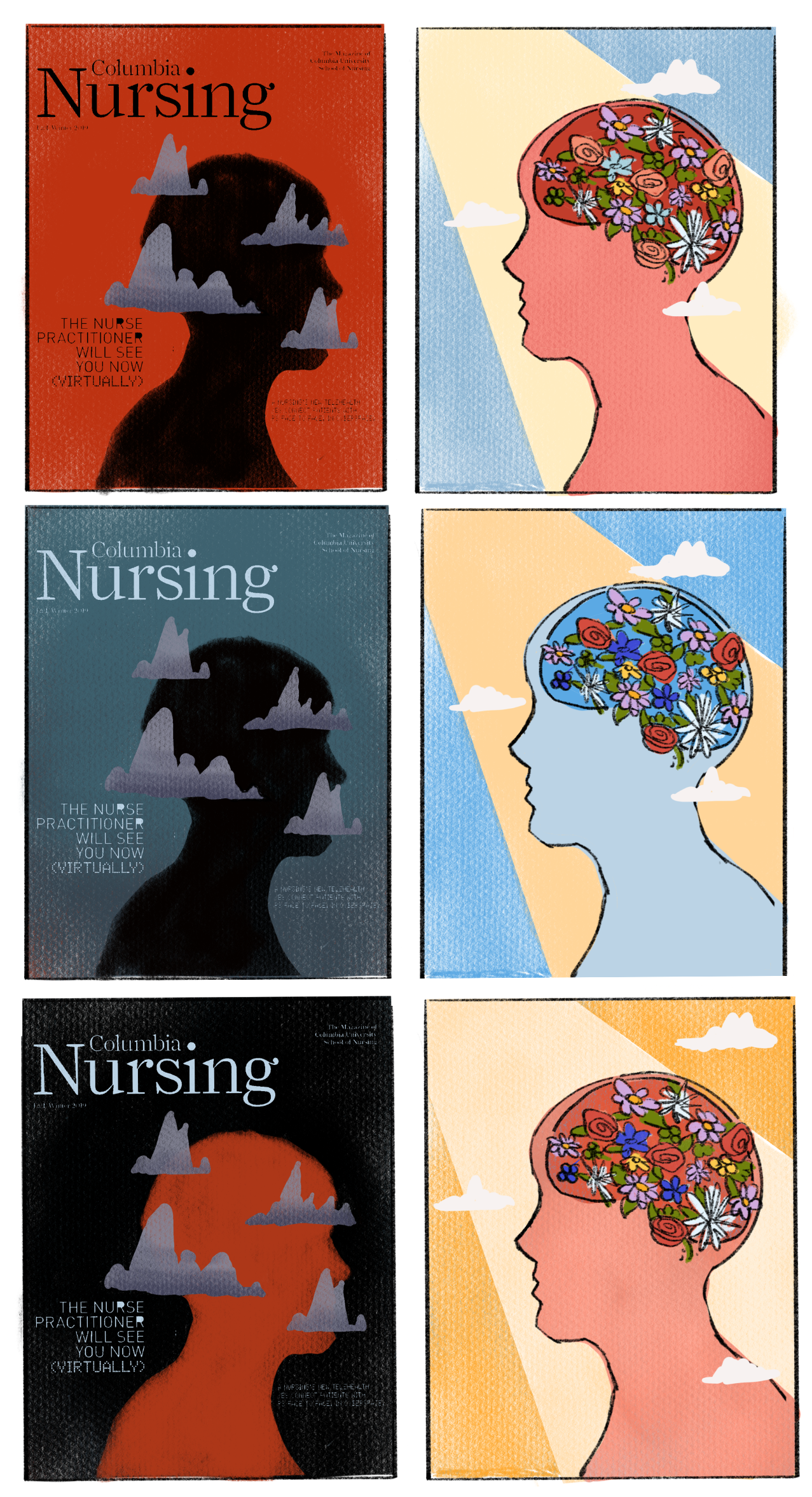 For this project, I was tasked with creating a cover and interior illustration to go along with an article about mental health in the Spring 2023 issue of Columbia Nursing Magazine. I started with sketches and color studies and decided to use cut paper for the final images.