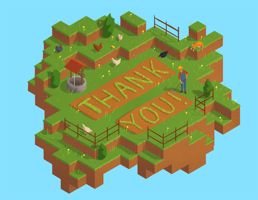 This piece is a continuation of my floating island series created to be a thank you card. I wanted to create a larger landscape with more room to add scenery on top. I liked the idea of working the text into the environment and came to the idea of it being a farm or garden scene.
